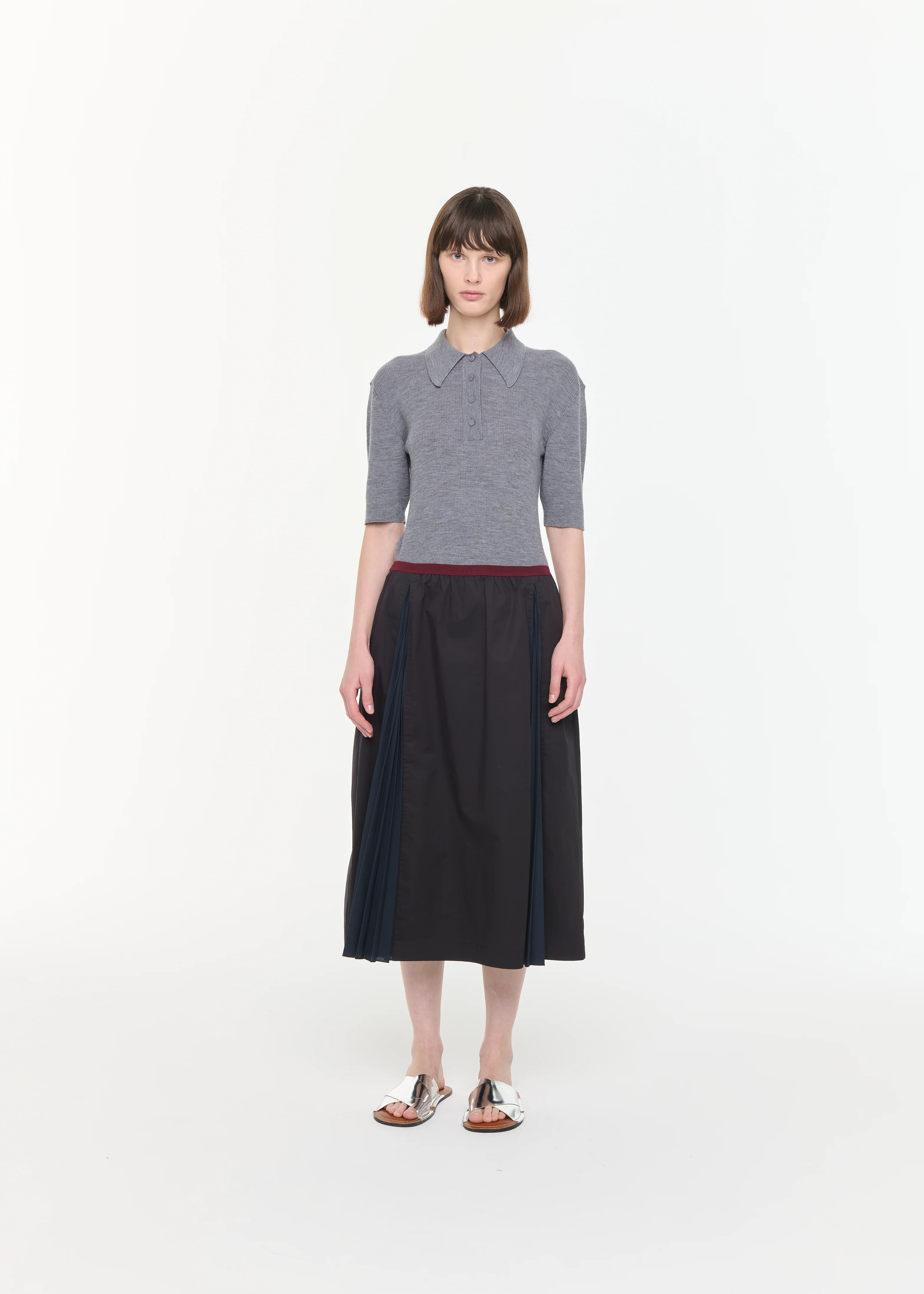 A-line black cotton midi skirt with side plissé panels and elasticated contrast waistband