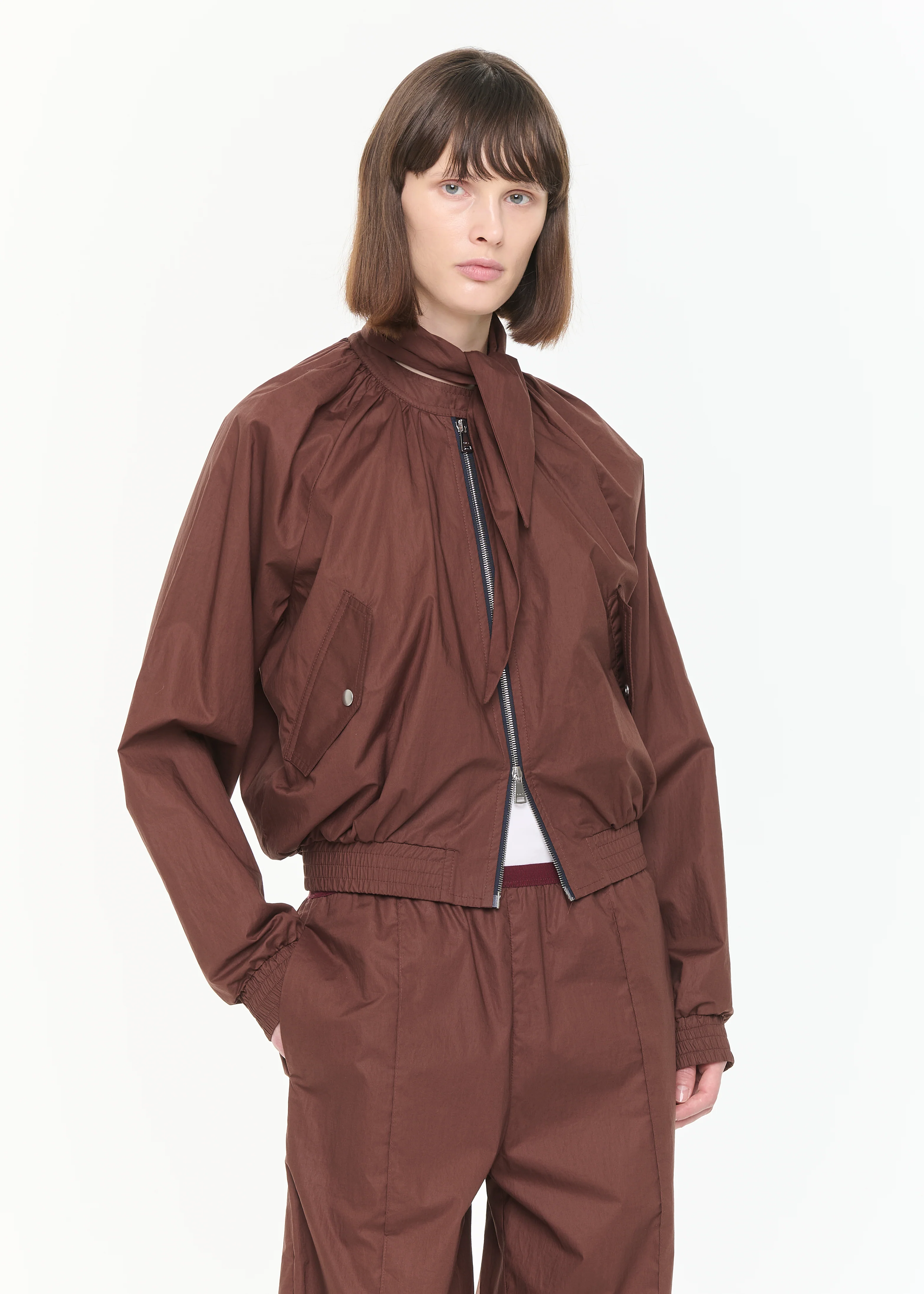 Technical light cotton zipped bomber jacket with scarf. Raglan sleeves, two patch pockets.