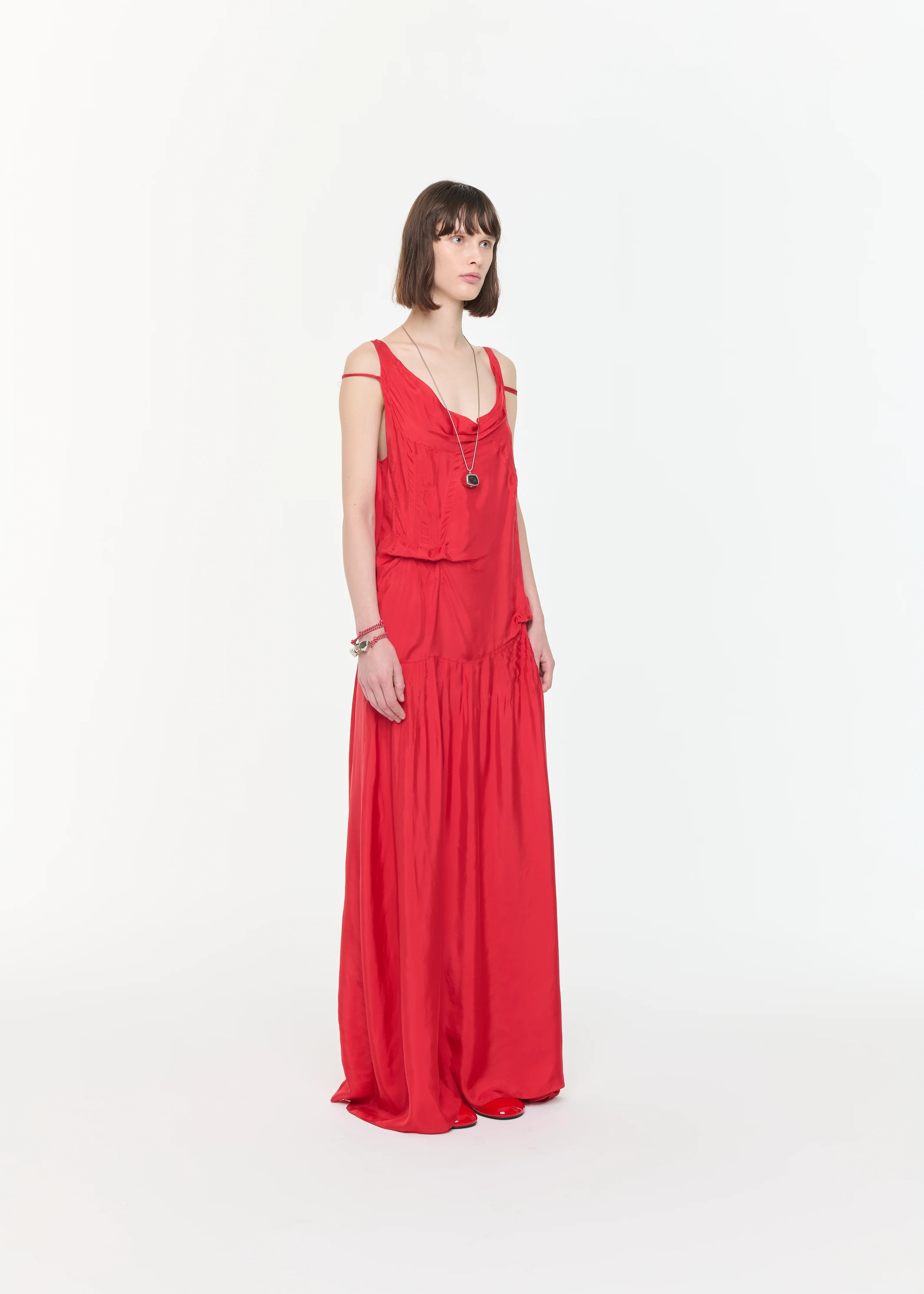 Fire red long dress in light viscose twill with asymmetrical shoulders and draping.