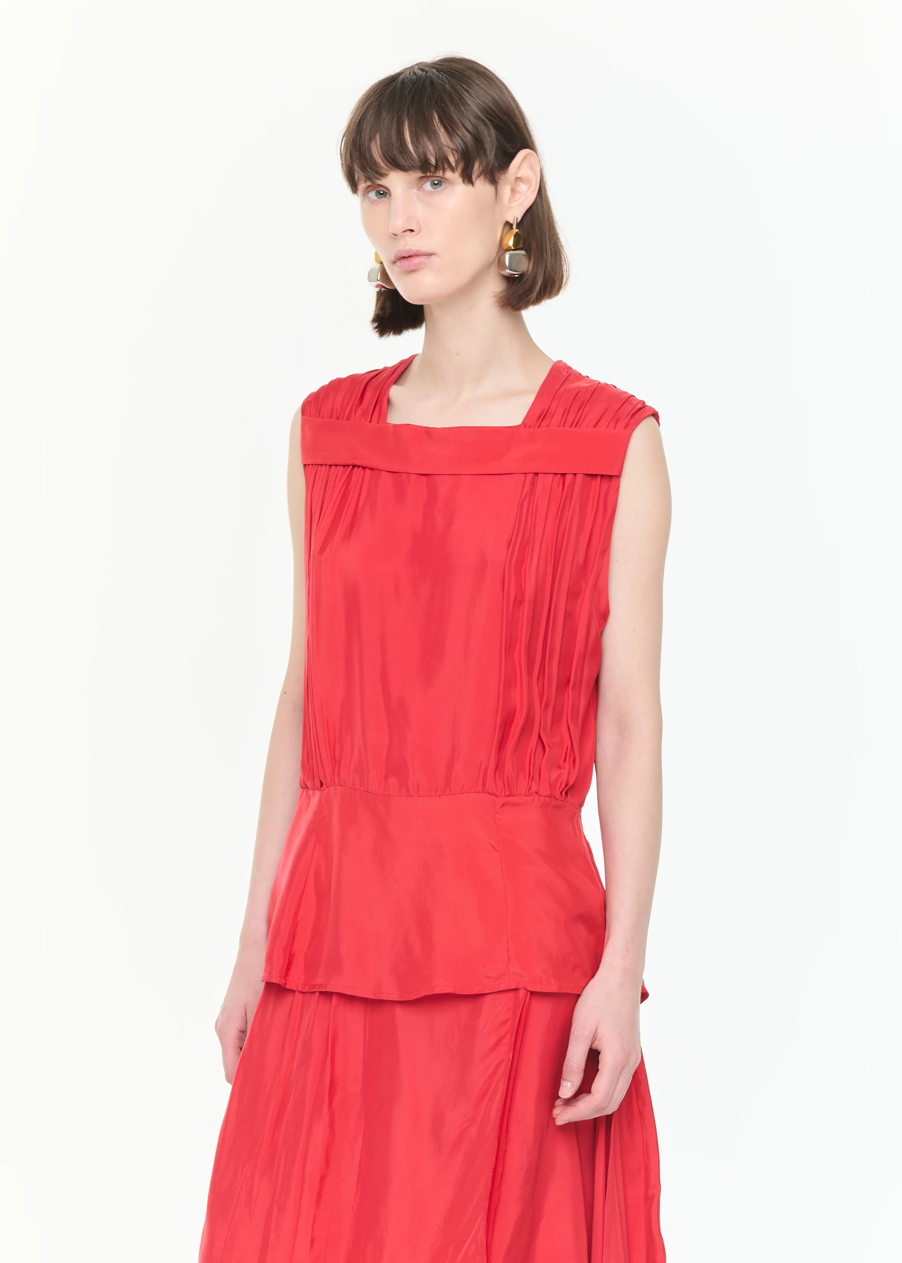 Fire red top in light viscose twill with front draping and empire-style band.