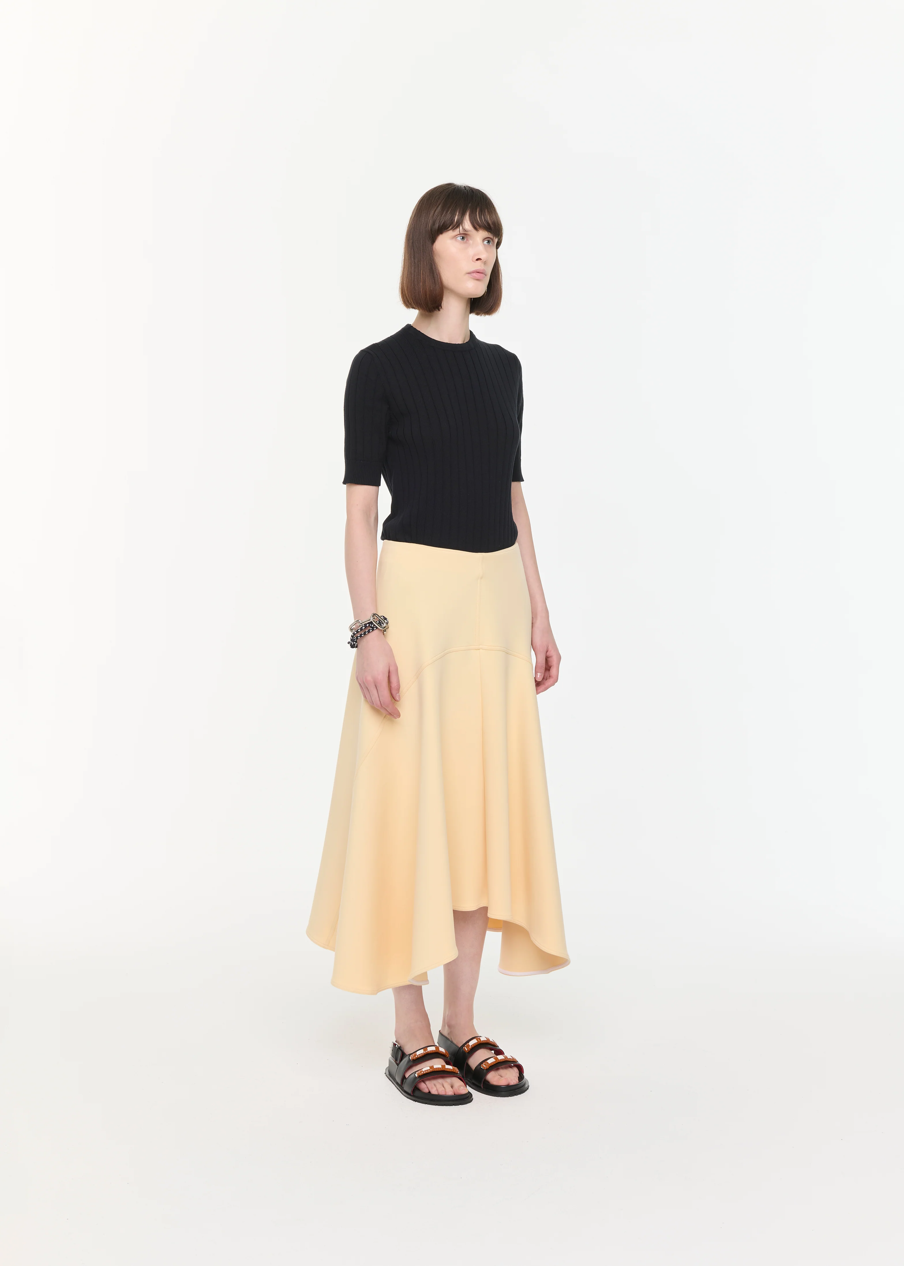 Pale yellow fleece midi skirt with curved structural seams and an asymmetric hem
