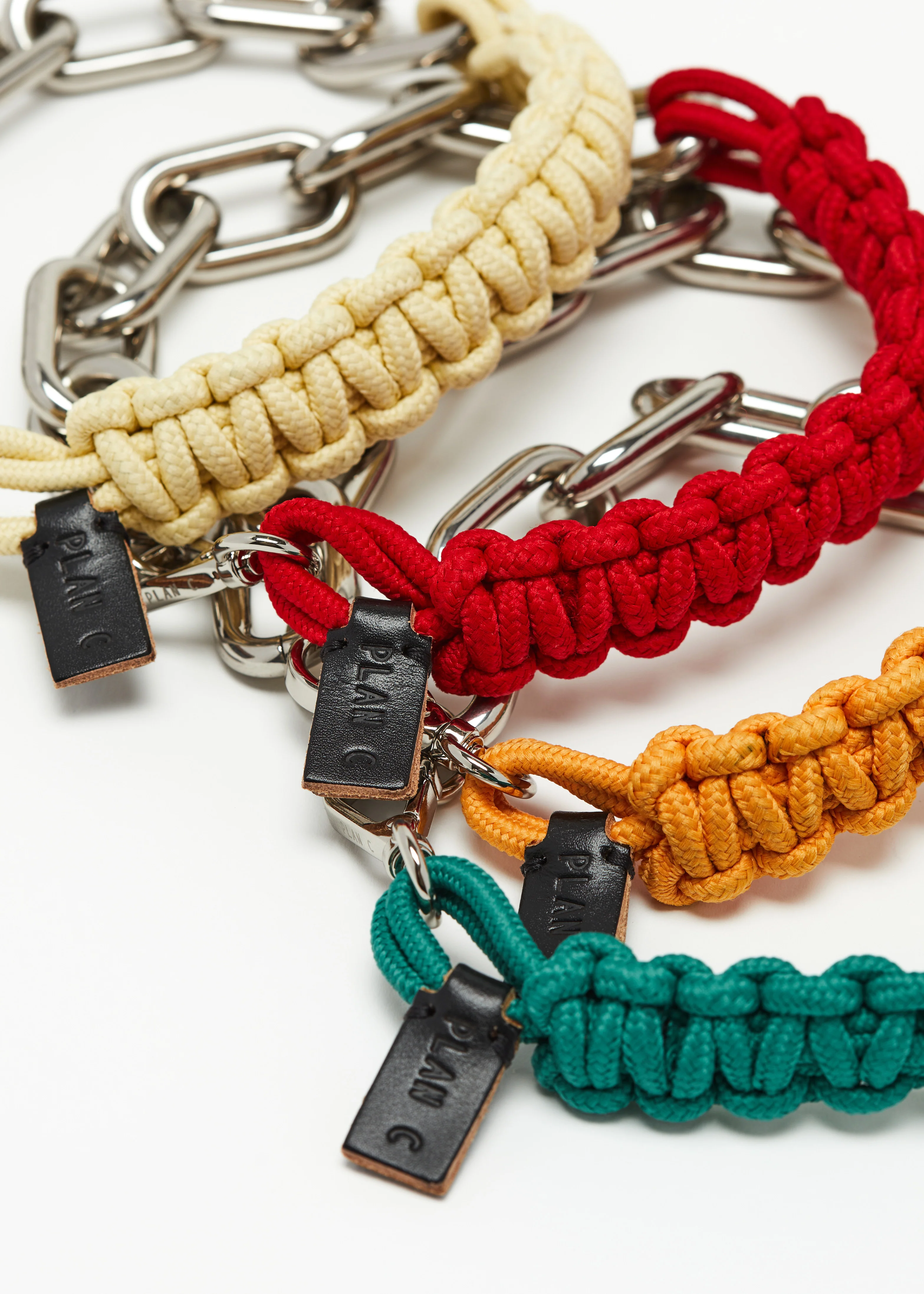 Green braided lanyard and chunky chain necklace.