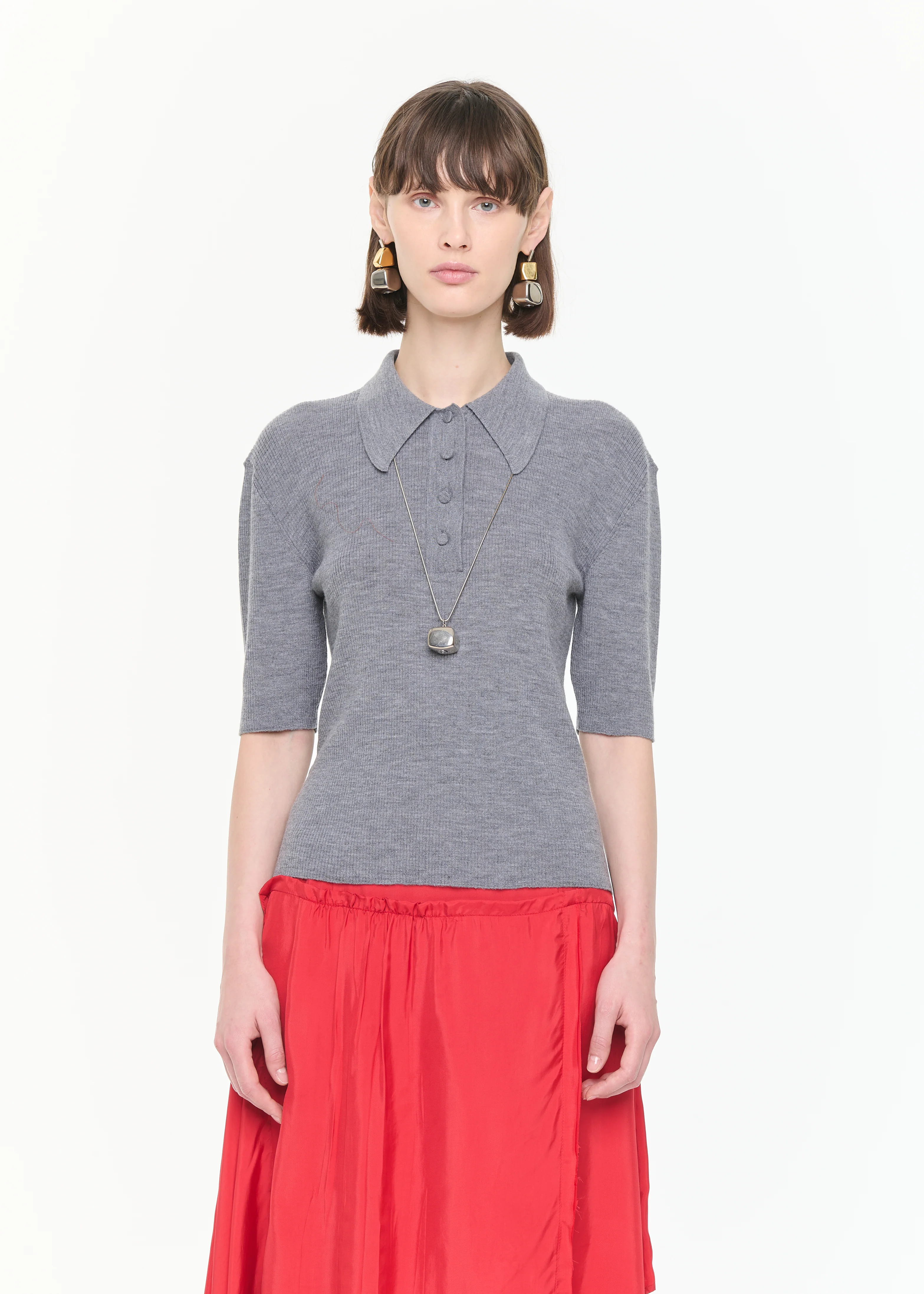 Grey melange ribbed knit short sleeves polo with covered buttons.