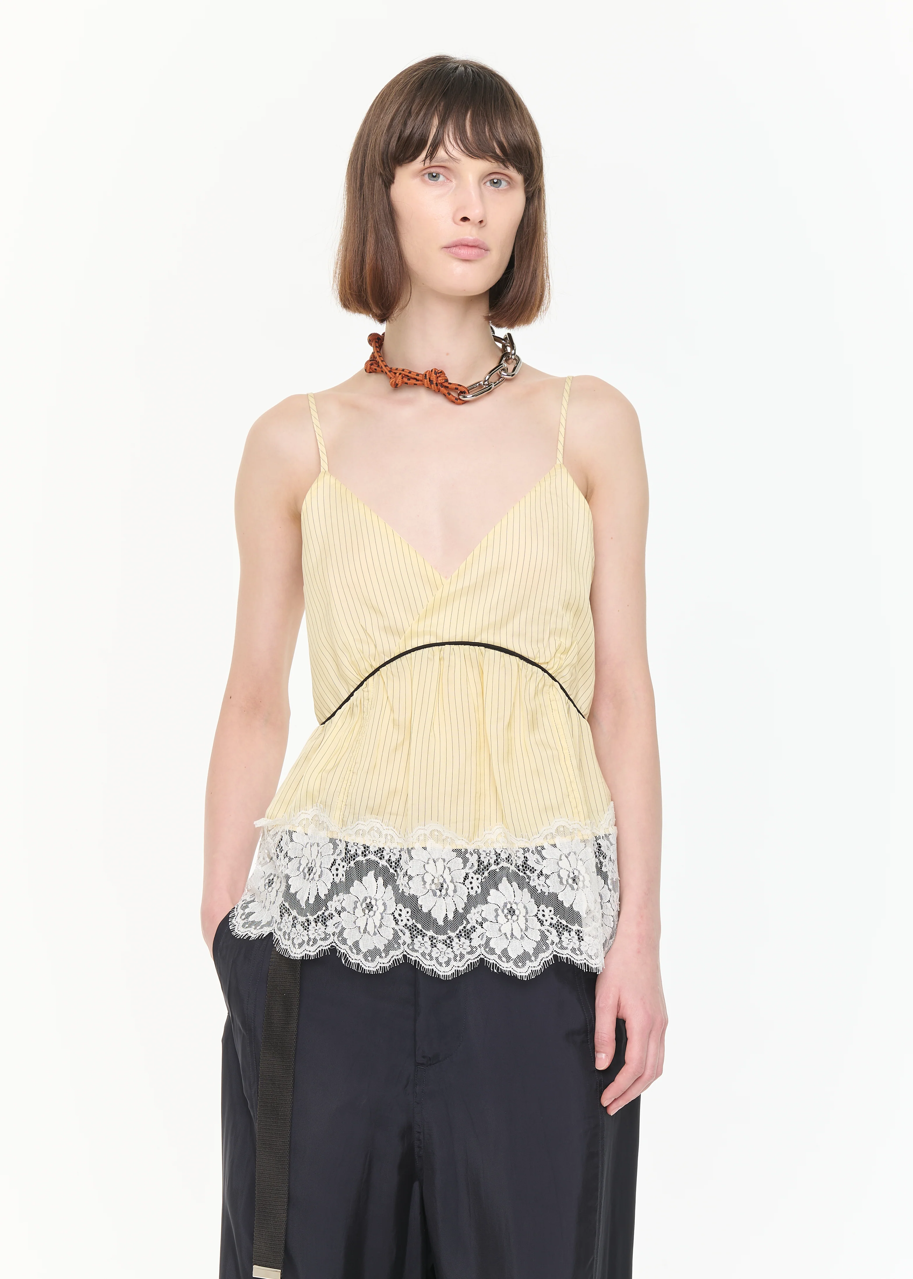 Striped cupro top, V-neckline, contrast empire waist piping, deep scalloped lace hem.