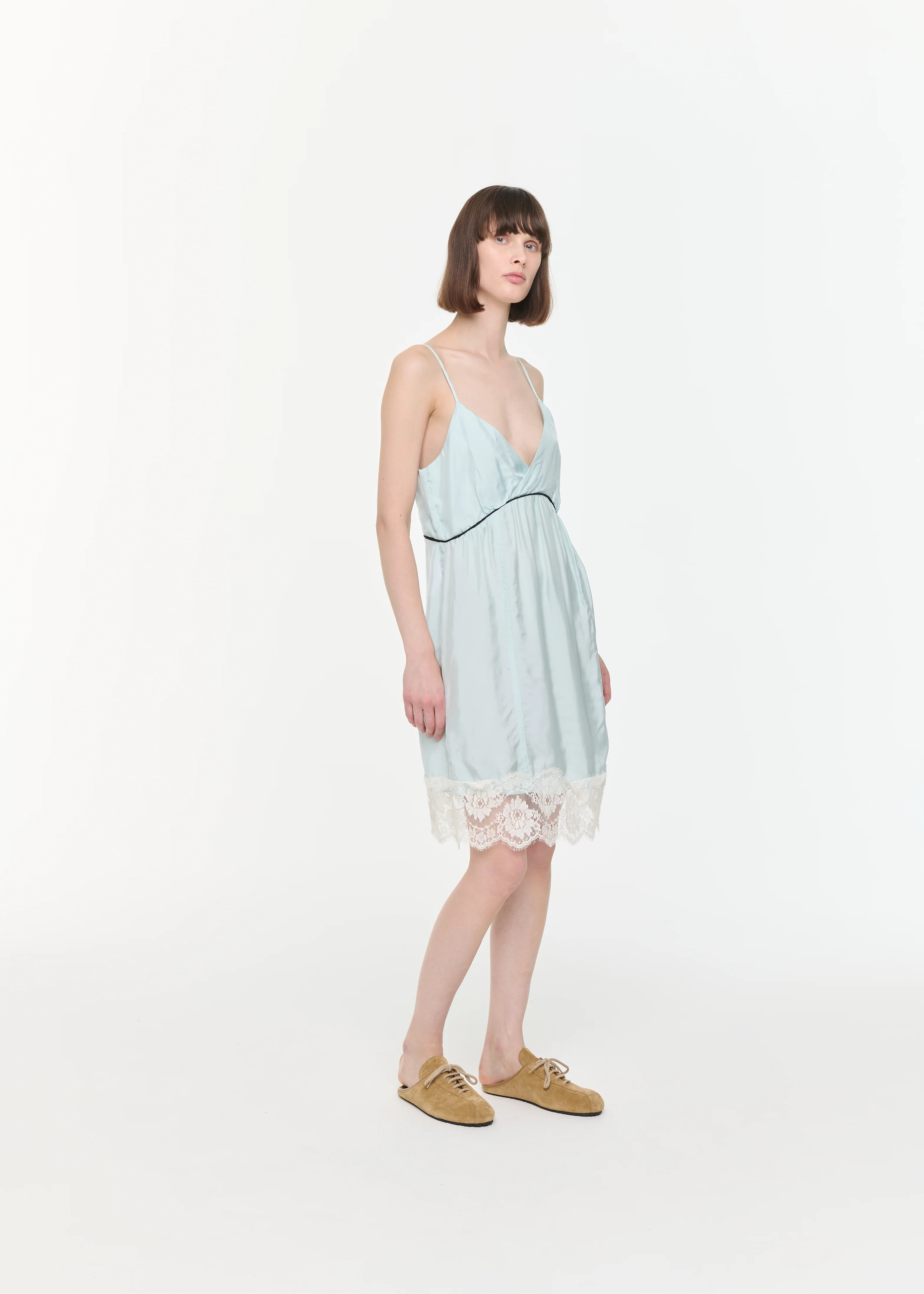 Midi slip dress in light viscose twill, with V neck and lace details.