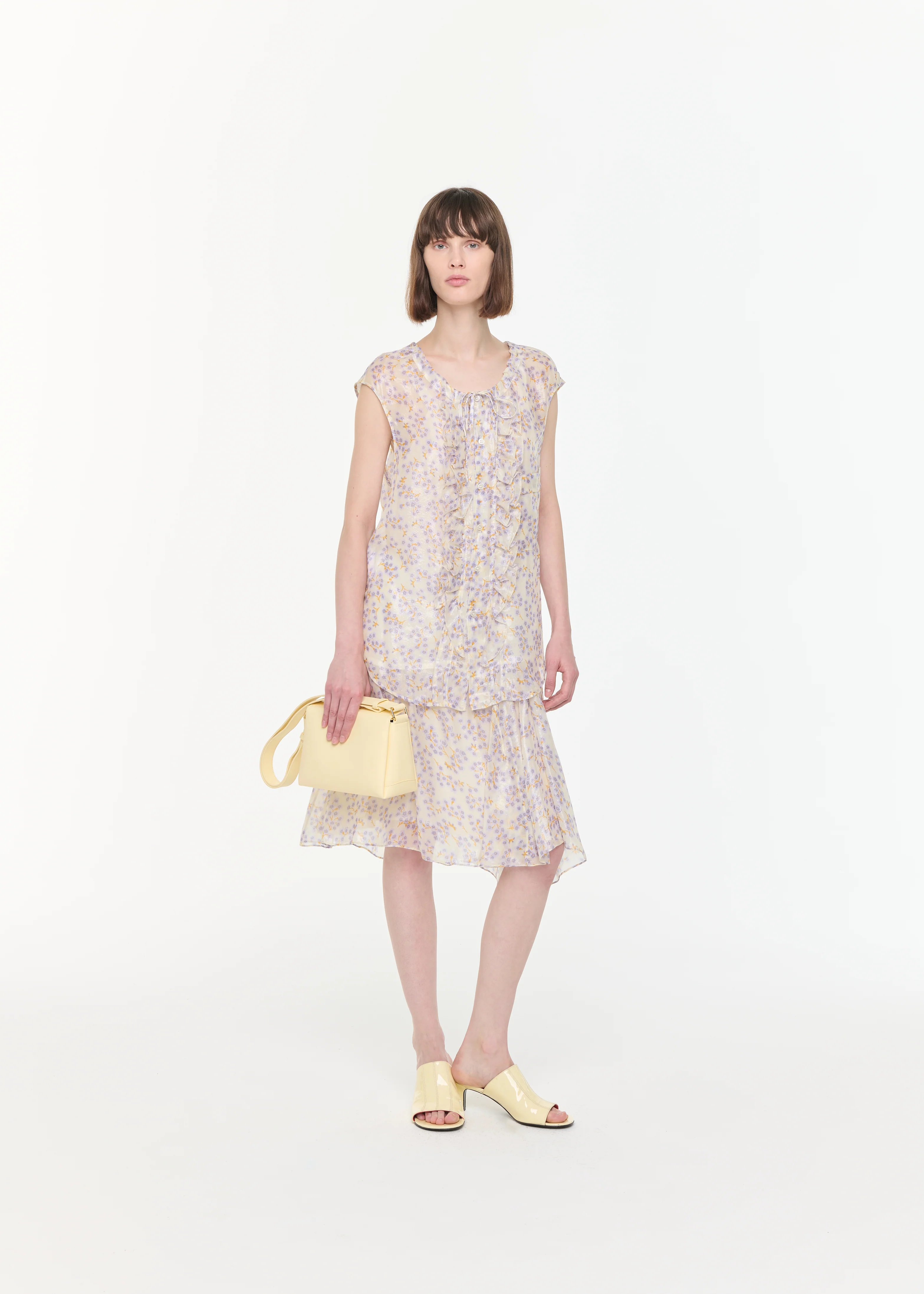 Purple flower print skirt in shiny silk chiffon with asymmetrical hem and draping on a side. Hidden zip closure.