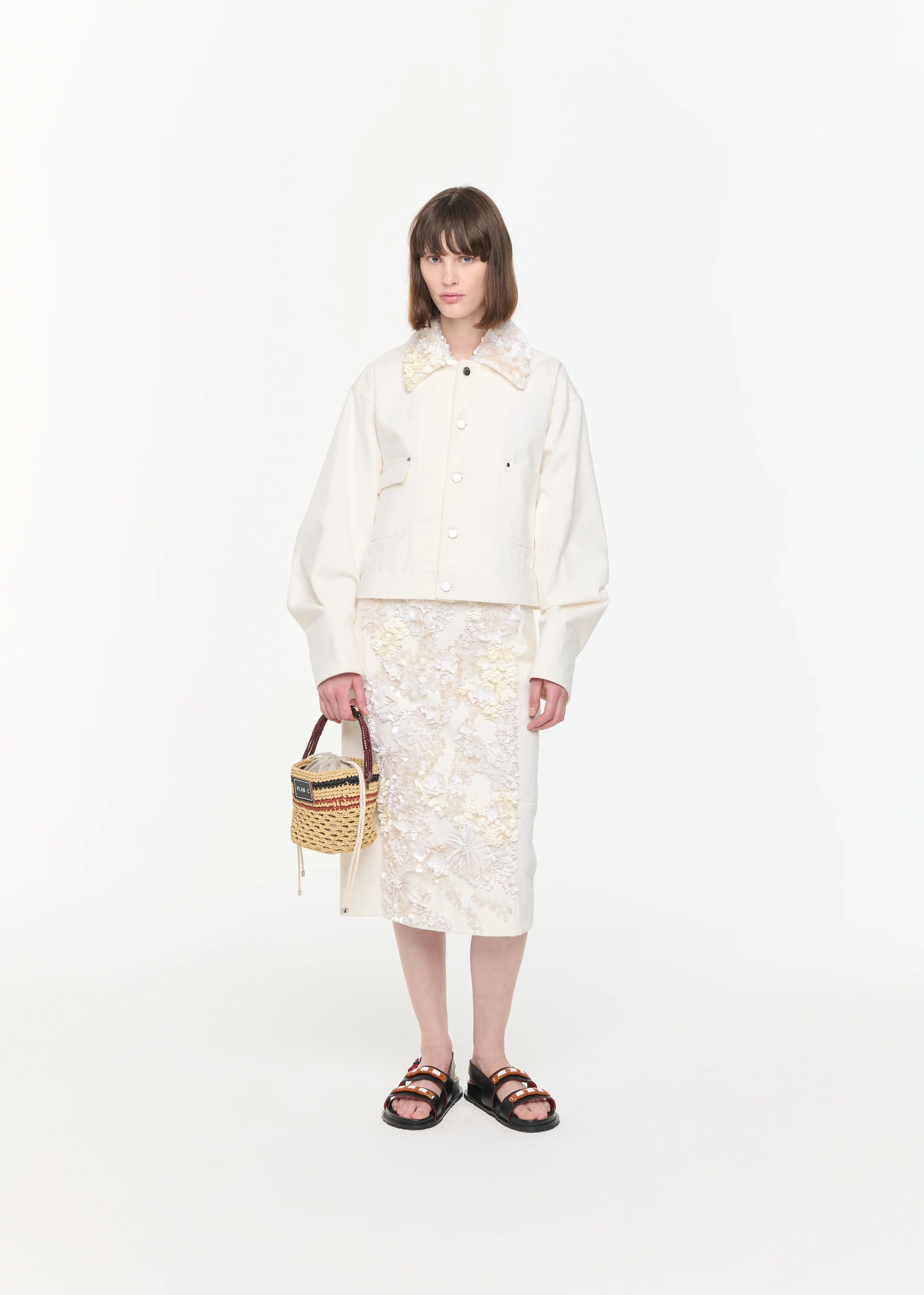 White drill cropped jacket with removable shirt collar embellished with sequins. Front closure with metal buttons, two pockets.