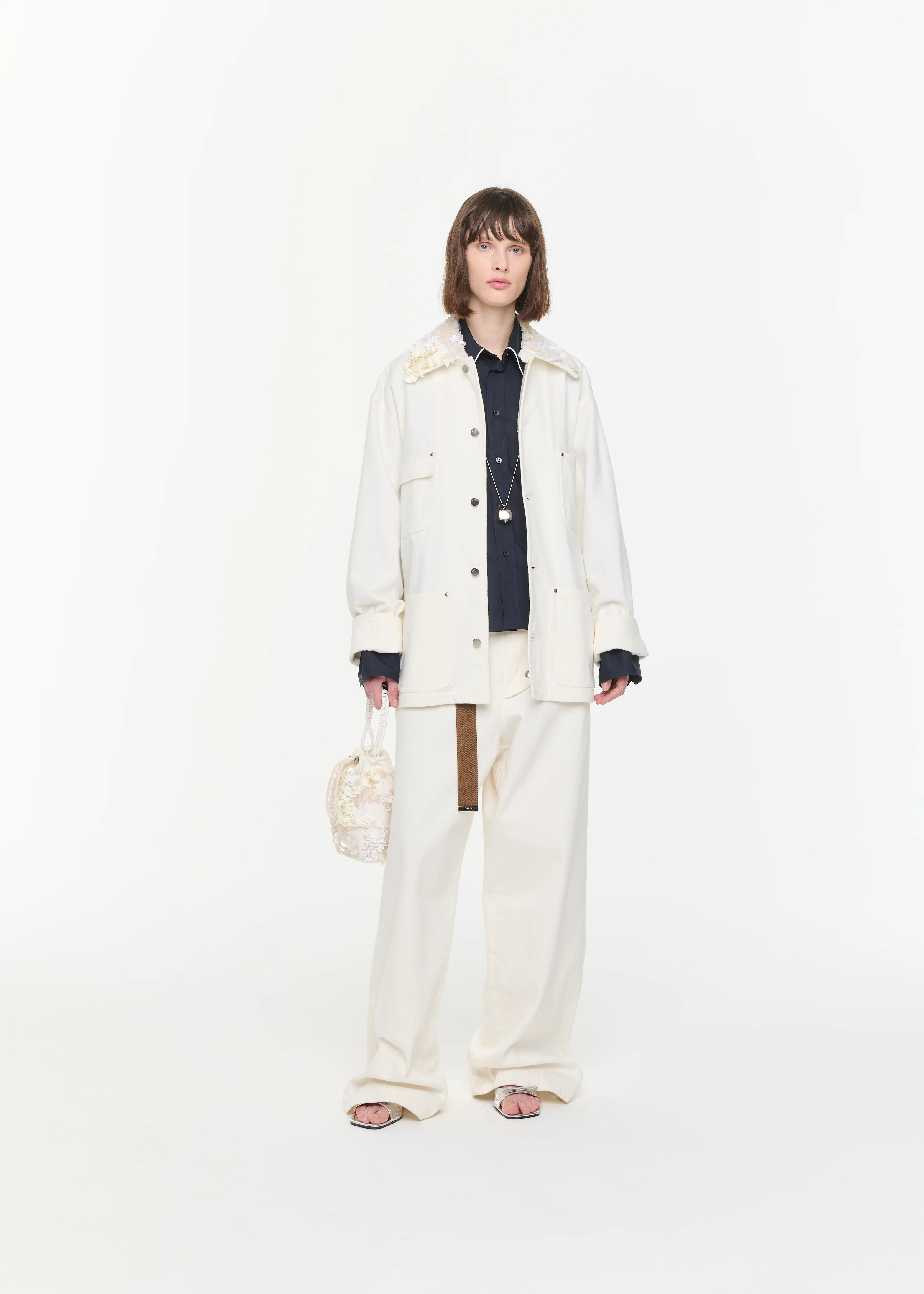 White drill jacket with removable shirt collar embellished with sequins. Front closure with metal buttons, four pockets.